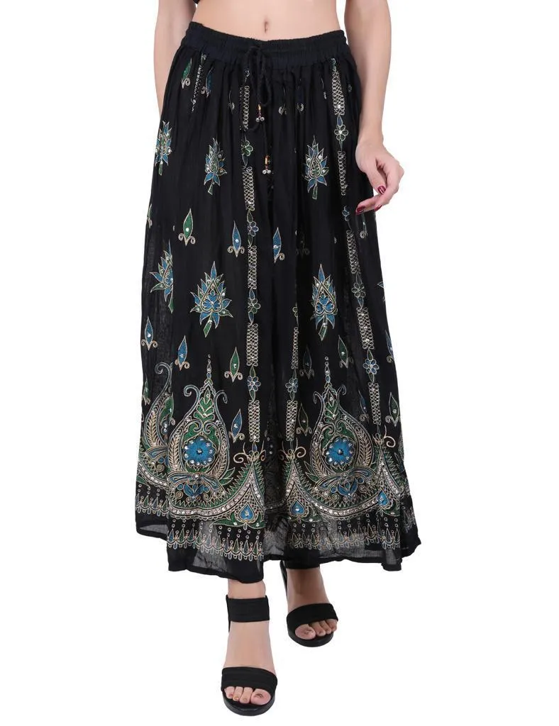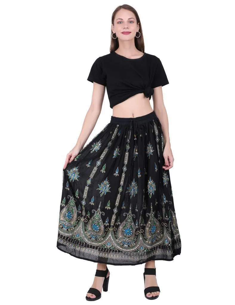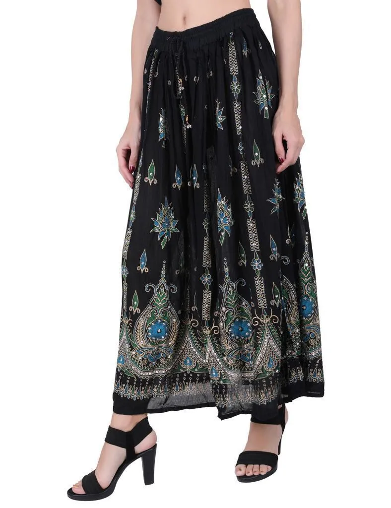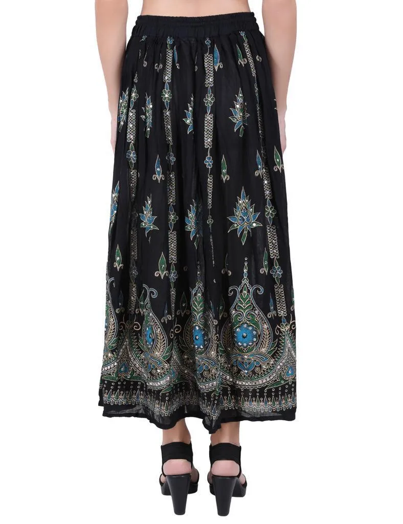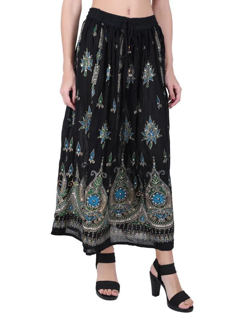 Hermosa falda en rayón, con apliques de estampado bohemio etnico brillante y letejuelas, elaborado en India.