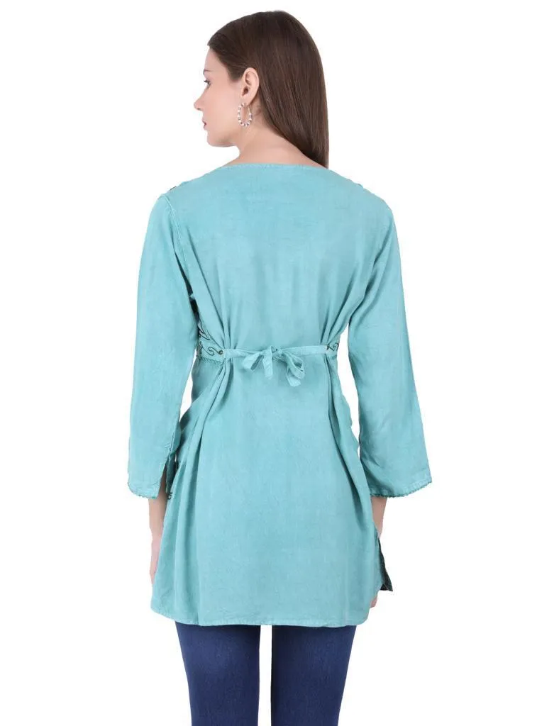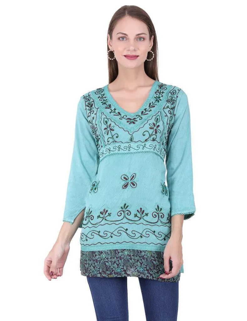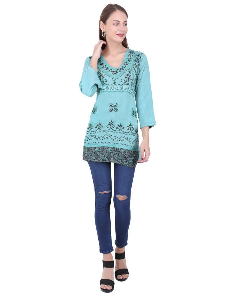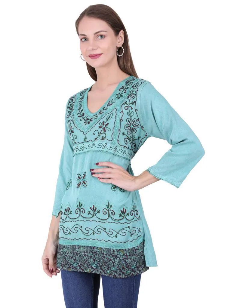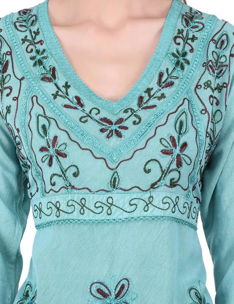 Hermosa kurta menta con bordado frontal bohemio, en viscosa, hecha en india.